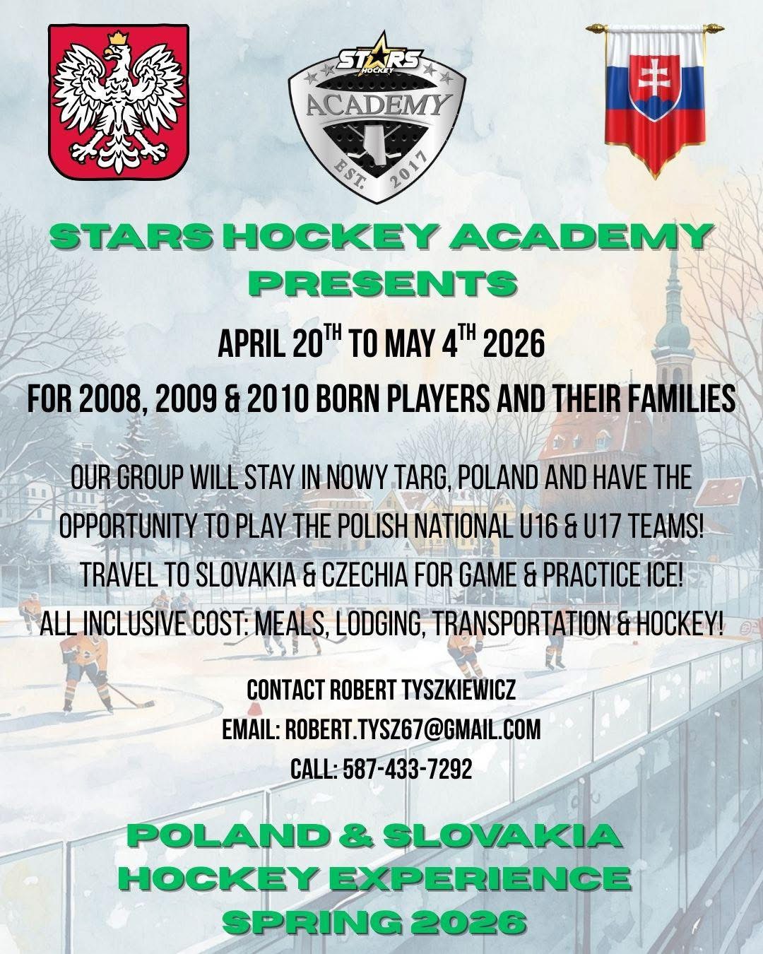 Stars Hockey Academy is proud to present an international hockey and cultural experience for 2008, 2009, and 2010 born players and their families, running from April 20 to May 4, 2026.